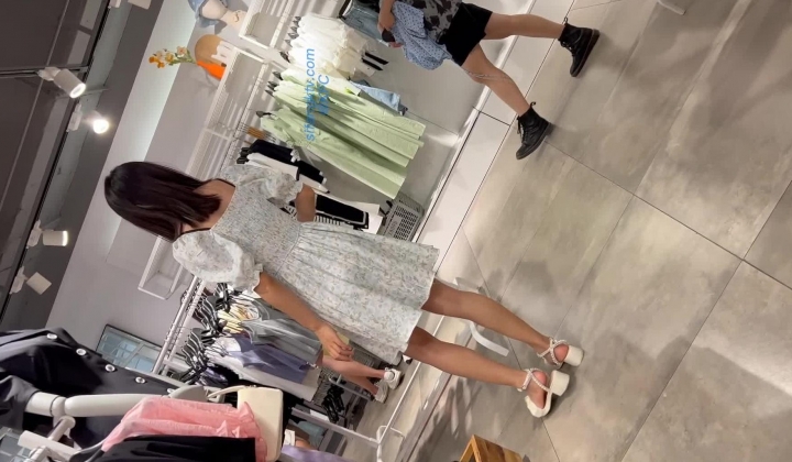 商城服装店一袭蓝裙黑胸罩小女神,性感的半透明白内